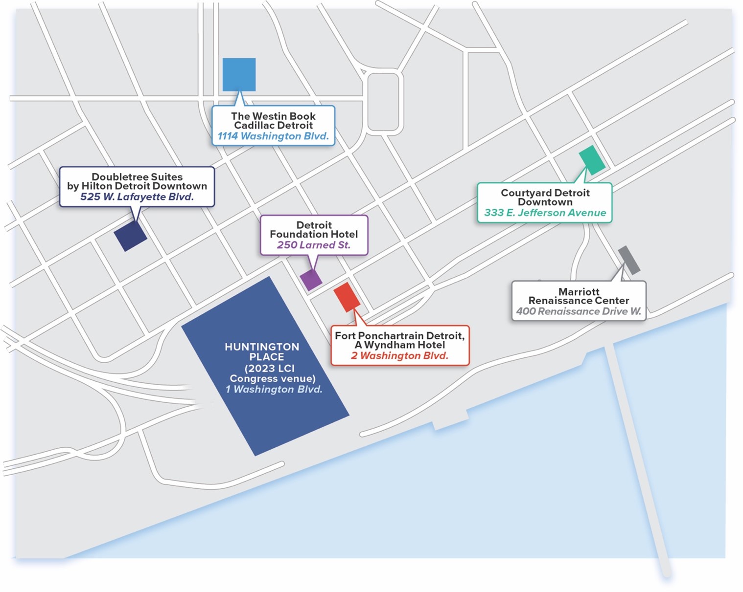 We look forward to welcoming you to Congress at Huntington Place, a centrally-located, state-of-the-art convention center with spectacular river views. This unbeatable venue is close to beautiful, comfortable hotels within walking distance—some along the famous Detroit International RiverWalk—to the venue. To offer you the best choice of accommodations, we reserved several hotel blocks with special Congress rates.